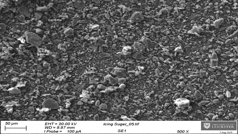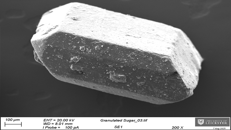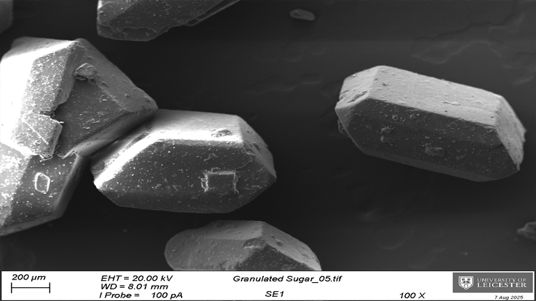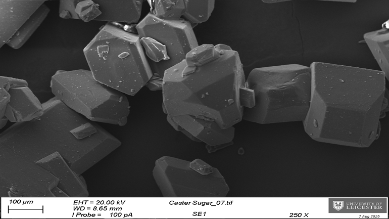 The University of Leicester’s SEM technology has been able to magnify materials like caster sugar, icing sugar and granulated sugar to compare their surface topography and chemical composition.