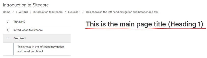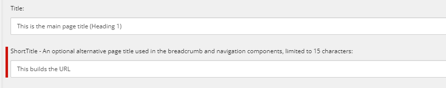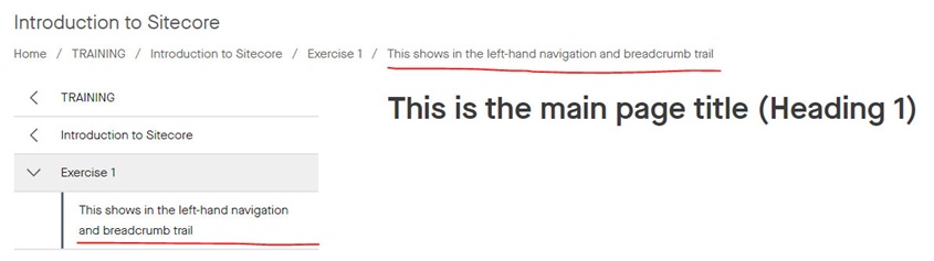 As shown in 'create a new page', the title (or Heading 1) of the page will often be different to the page name in the content tree. There is a field in Sitecore to place the title of the page, with another field below it for the 'short title.' The short title will appear in the left-hand navigation and breadcrumb trail of the page. It may not need to differ from the main title, but it may also need to be shortened slightly. For instance, if the title of the page was 'This is the main page title (Heading 1)'. Your short title could be: 'Main page title'.